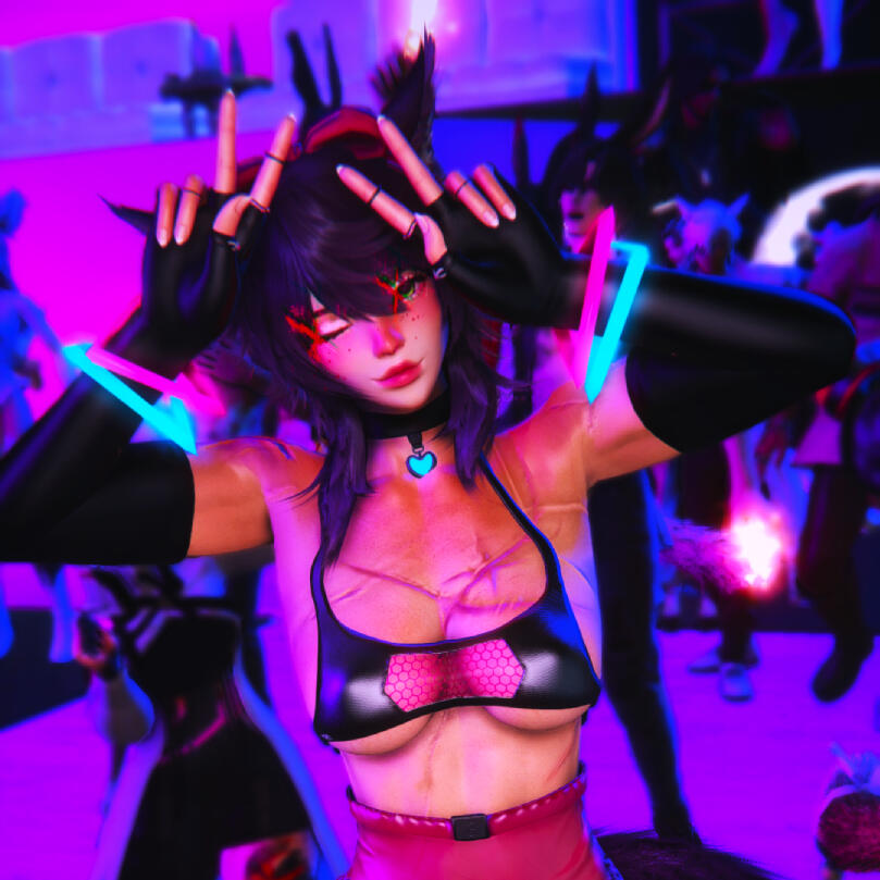 Swaying with the crowd naturally as lights and music bump about. She seems to be having a good time. Her eyes glint a little as you catch her gaze and she grins at you.